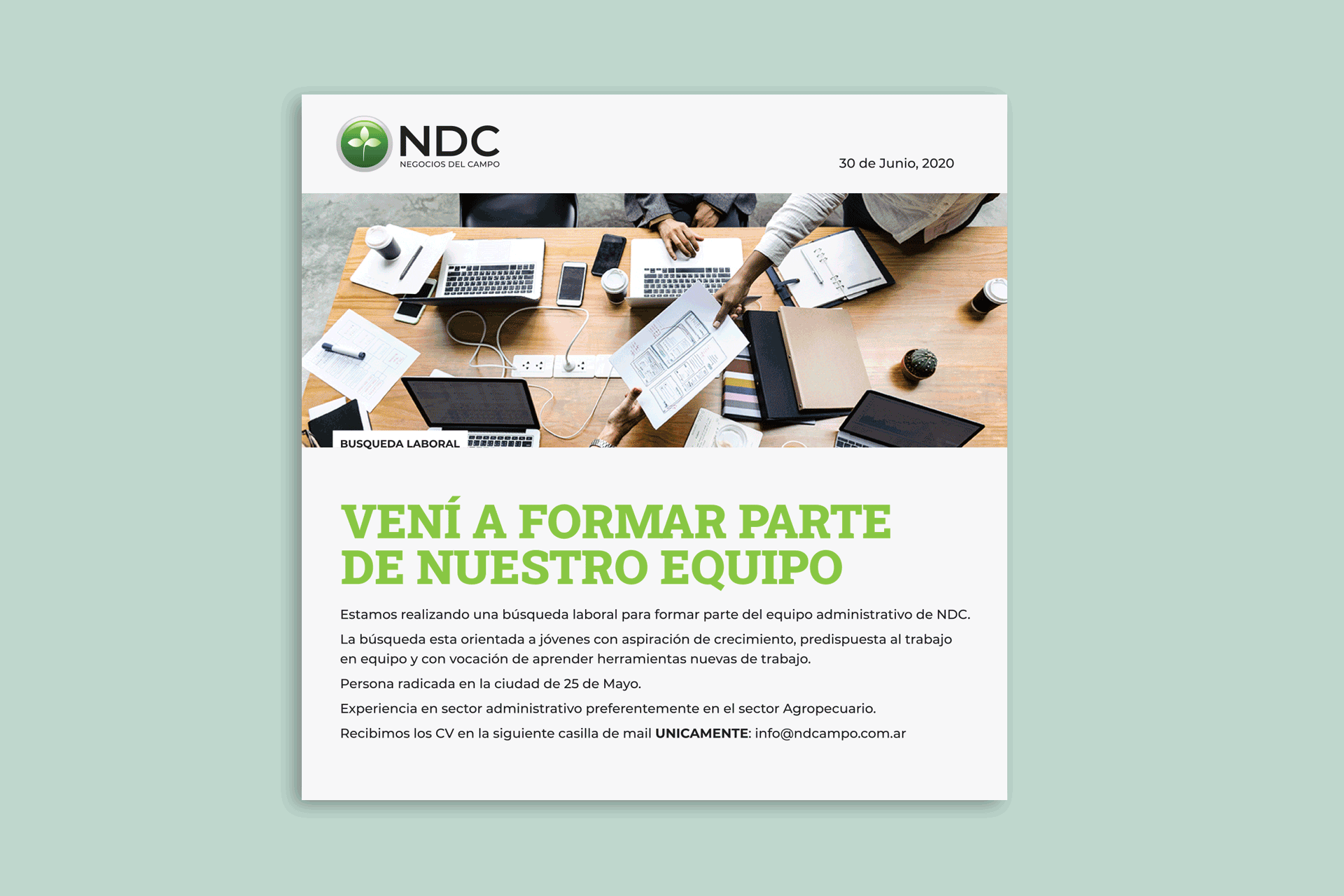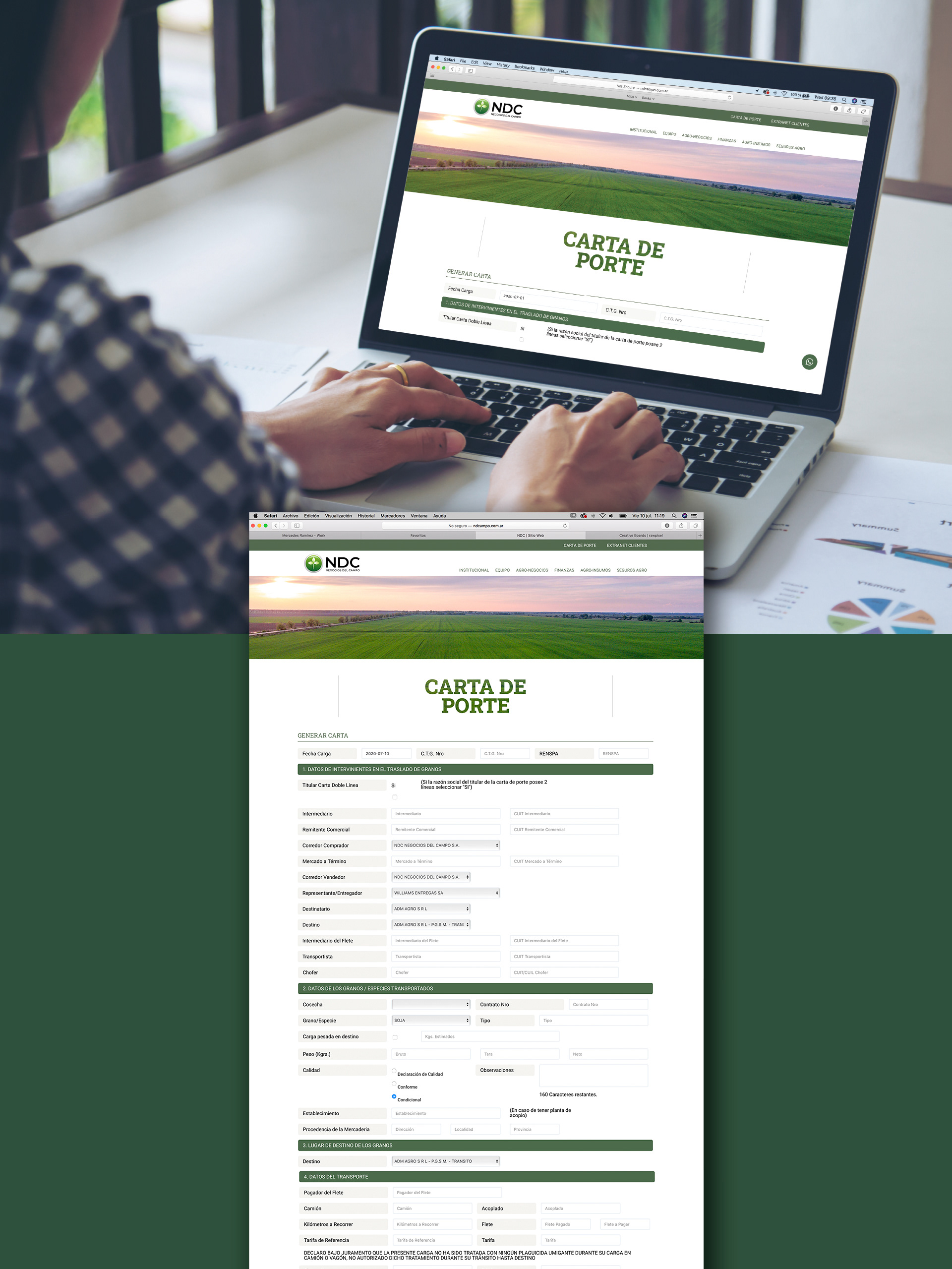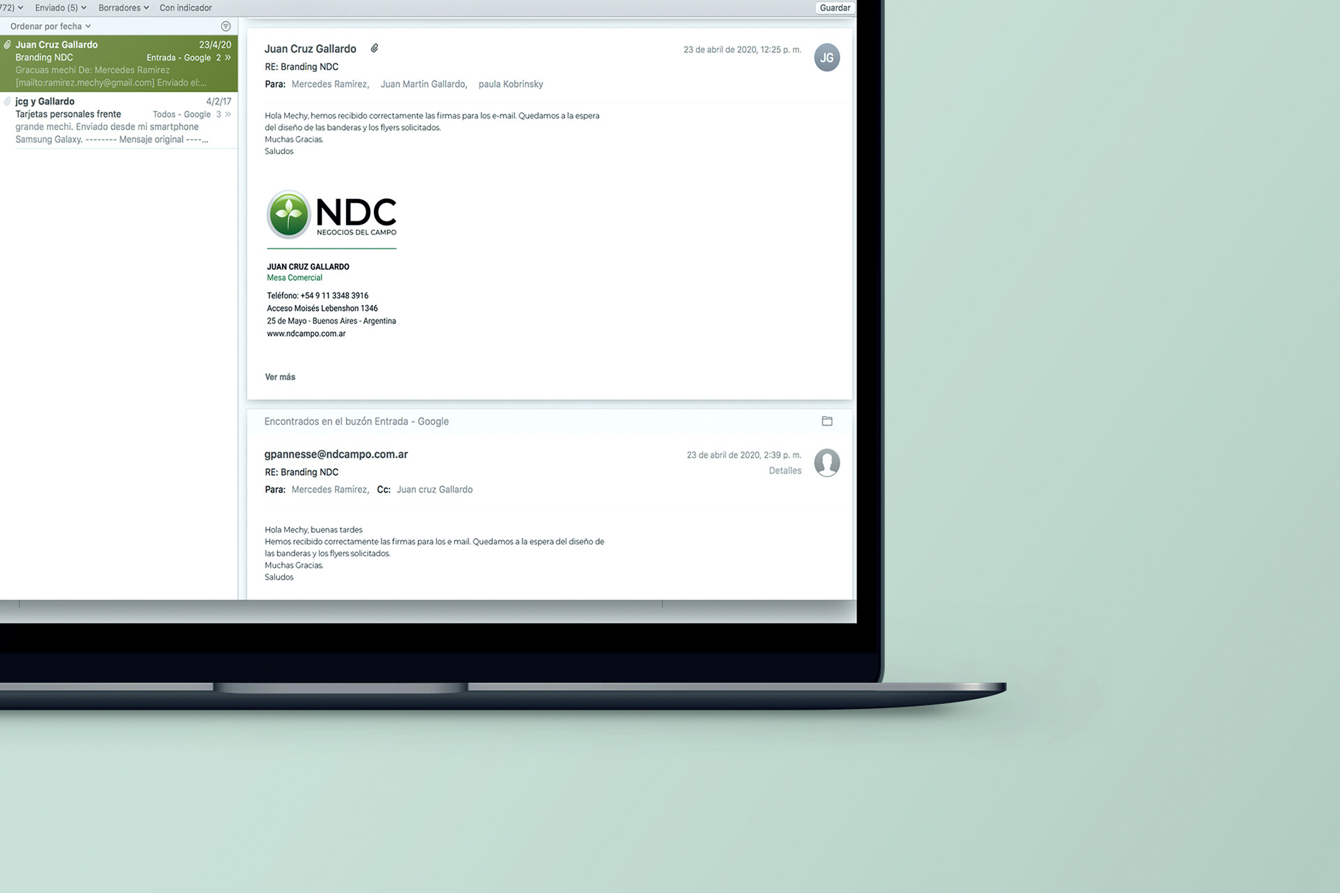Diseñamos el branding para NDC, hoja membreteada, tarjetas personales, firma emails, y sitio web. NDC es una empresa con experiencia en la cadena comercial de granos y venta de insumos para el campo argentino.